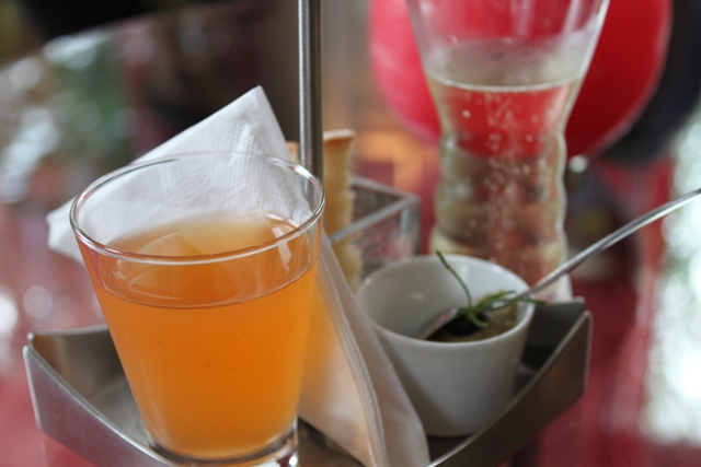 Gestartet haben wir mit einer Tomatenessenz mit Olivenpaté und einem Cremant Sekt.